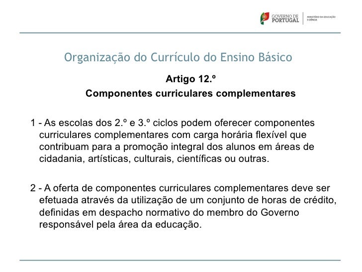15. 15. Organização do Currículo do Ensino Básico Artigo 12.º Componentes curriculares complementares1 - As escolas dos 2.º e 3.º ciclos podem oferecer componentes curriculares complementares com carga horária flexível que contribuam para a promoção integral dos alunos em áreas de cidadania, artísticas, culturais, científicas ou outras.2 - A oferta de componentes curriculares complementares deve ser efetuada através da utilização de um conjunto de horas de crédito, definidas em despacho normativo do membro do Governo responsável pela área da educação.