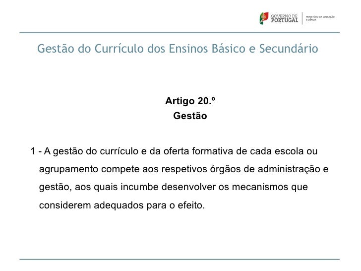 16. 16. Gestão do Currículo dos Ensinos Básico e Secundário Artigo 20.º Gestão1 - A gestão do currículo e da oferta formativa de cada escola ou agrupamento compete aos respetivos órgãos de administração e gestão, aos quais incumbe desenvolver os mecanismos que considerem adequados para o efeito.