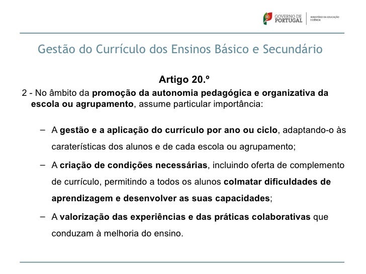17. 17. Gestão do Currículo dos Ensinos Básico e Secundário Artigo 20.º2 - No âmbito da promoção da autonomia pedagógica e organizativa da escola ou agrupamento, assume particular importância: – A gestão e a aplicação do currículo por ano ou ciclo, adaptando-o às caraterísticas dos alunos e de cada escola ou agrupamento; – A criação de condições necessárias, incluindo oferta de complemento de currículo, permitindo a todos os alunos colmatar dificuldades de aprendizagem e desenvolver as suas capacidades; – A valorização das experiências e das práticas colaborativas que conduzam à melhoria do ensino.