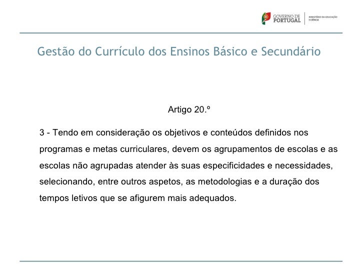 18. 18. Gestão do Currículo dos Ensinos Básico e Secundário Artigo 20.º3 - Tendo em consideração os objetivos e conteúdos definidos nosprogramas e metas curriculares, devem os agrupamentos de escolas e asescolas não agrupadas atender às suas especificidades e necessidades,selecionando, entre outros aspetos, as metodologias e a duração dostempos letivos que se afigurem mais adequados.
