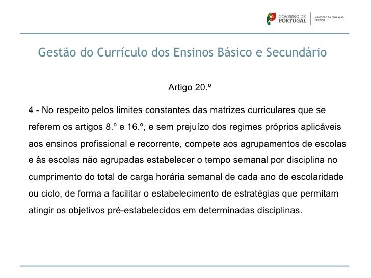 19. 19. Gestão do Currículo dos Ensinos Básico e Secundário Artigo 20.º4 - No respeito pelos limites constantes das matrizes curriculares que sereferem os artigos 8.º e 16.º, e sem prejuízo dos regimes próprios aplicáveisaos ensinos profissional e recorrente, compete aos agrupamentos de escolase às escolas não agrupadas estabelecer o tempo semanal por disciplina nocumprimento do total de carga horária semanal de cada ano de escolaridadeou ciclo, de forma a facilitar o estabelecimento de estratégias que permitamatingir os objetivos pré-estabelecidos em determinadas disciplinas.