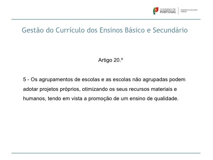 20. 20. Gestão do Currículo dos Ensinos Básico e Secundário Artigo 20.º5 - Os agrupamentos de escolas e as escolas não agrupadas podemadotar projetos próprios, otimizando os seus recursos materiais ehumanos, tendo em vista a promoção de um ensino de qualidade.