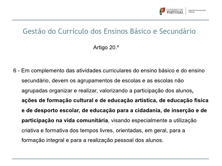 21. 21. Gestão do Currículo dos Ensinos Básico e Secundário Artigo 20.º6 - Em complemento das atividades curriculares do ensino básico e do ensino secundário, devem os agrupamentos de escolas e as escolas não agrupadas organizar e realizar, valorizando a participação dos alunos, ações de formação cultural e de educação artística, de educação física e de desporto escolar, de educação para a cidadania, de inserção e de participação na vida comunitária, visando especialmente a utilização criativa e formativa dos tempos livres, orientadas, em geral, para a formação integral e para a realização pessoal dos alunos.