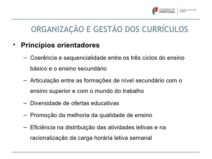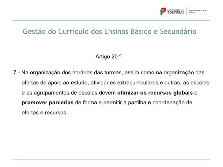 22. 22. Gestão do Currículo dos Ensinos Básico e Secundário Artigo 20.º7 - Na organização dos horários das turmas, assim como na organização das ofertas de apoio ao estudo, atividades extracurriculares e outras, as escolas e os agrupamentos de escolas devem otimizar os recursos globais e promover parcerias de forma a permitir a partilha e coordenação de ofertas e recursos.