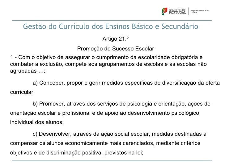 23. 23. Gestão do Currículo dos Ensinos Básico e Secundário Artigo 21.º Promoção do Sucesso Escolar1 - Com o objetivo de assegurar o cumprimento da escolaridade obrigatória ecombater a exclusão, compete aos agrupamentos de escolas e às escolas nãoagrupadas …: a) Conceber, propor e gerir medidas específicas de diversificação da ofertacurricular; b) Promover, através dos serviços de psicologia e orientação, ações deorientação escolar e profissional e de apoio ao desenvolvimento psicológicoindividual dos alunos; c) Desenvolver, através da ação social escolar, medidas destinadas acompensar os alunos economicamente mais carenciados, mediante critériosobjetivos e de discriminação positiva, previstos na lei;