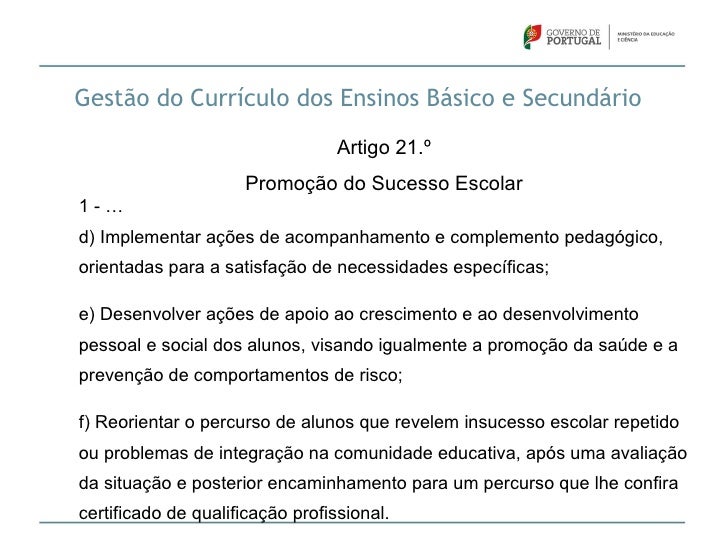 24. 24. Gestão do Currículo dos Ensinos Básico e Secundário Artigo 21.º Promoção do Sucesso Escolar1-…d) Implementar ações de acompanhamento e complemento pedagógico,orientadas para a satisfação de necessidades específicas;e) Desenvolver ações de apoio ao crescimento e ao desenvolvimentopessoal e social dos alunos, visando igualmente a promoção da saúde e aprevenção de comportamentos de risco;f) Reorientar o percurso de alunos que revelem insucesso escolar repetidoou problemas de integração na comunidade educativa, após uma avaliaçãoda situação e posterior encaminhamento para um percurso que lhe confiracertificado de qualificação profissional.