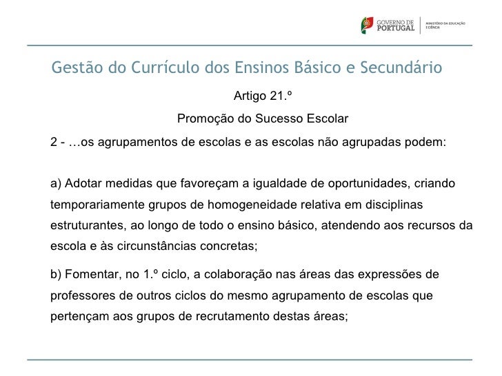 25. 25. Gestão do Currículo dos Ensinos Básico e Secundário Artigo 21.º Promoção do Sucesso Escolar2 - …os agrupamentos de escolas e as escolas não agrupadas podem:a) Adotar medidas que favoreçam a igualdade de oportunidades, criandotemporariamente grupos de homogeneidade relativa em disciplinasestruturantes, ao longo de todo o ensino básico, atendendo aos recursos daescola e às circunstâncias concretas;b) Fomentar, no 1.º ciclo, a colaboração nas áreas das expressões deprofessores de outros ciclos do mesmo agrupamento de escolas quepertençam aos grupos de recrutamento destas áreas;