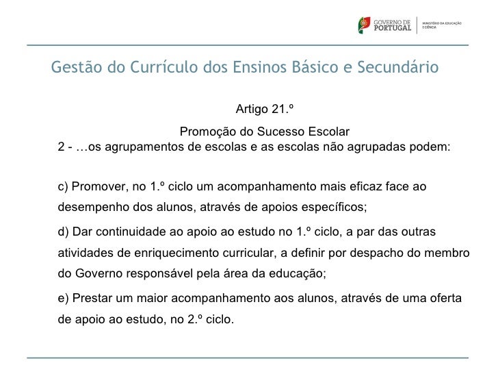26. 26. Gestão do Currículo dos Ensinos Básico e Secundário Artigo 21.º Promoção do Sucesso Escolar2 - …os agrupamentos de escolas e as escolas não agrupadas podem:c) Promover, no 1.º ciclo um acompanhamento mais eficaz face aodesempenho dos alunos, através de apoios específicos;d) Dar continuidade ao apoio ao estudo no 1.º ciclo, a par das outrasatividades de enriquecimento curricular, a definir por despacho do membrodo Governo responsável pela área da educação;e) Prestar um maior acompanhamento aos alunos, através de uma ofertade apoio ao estudo, no 2.º ciclo.