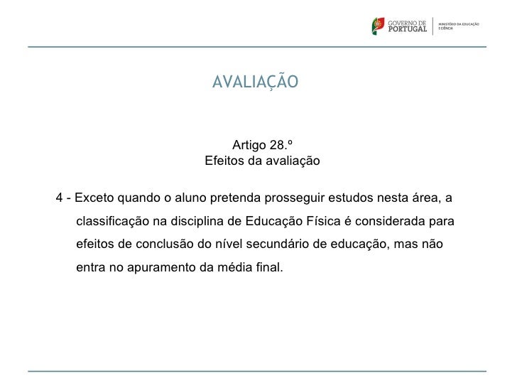 28. 28. AVALIAÇÃO Artigo 28.º Efeitos da avaliação4 - Exceto quando o aluno pretenda prosseguir estudos nesta área, a classificação na disciplina de Educação Física é considerada para efeitos de conclusão do nível secundário de educação, mas não entra no apuramento da média final.