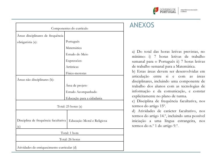 29. 29. Componentes do currículo ANEXOSÁreas disciplinares de frequênciaobrigatória (a): Português Matemática a) Do total das horas letivas previstas, no Estudo do Meio mínimo: i) 7 horas letivas de trabalho Expressões: semanal para o Português ii) 7 horas letivas Artísticas de trabalho semanal para a Matemática. Físico-motoras b) Estas áreas devem ser desenvolvidas em articulação entre si e com as áreasÁreas não disciplinares (b): disciplinares, incluindo uma componente de Área de projeto trabalho dos alunos com as tecnologias de Estudo Acompanhado informação e da comunicação, e constar Educação para a cidadania explicitamente no plano de turma. c) Disciplina de frequência facultativa, nos Total: 25 horas (a) termos do artigo 15º. d) Atividades de carácter facultativo, nos termos do artigo 14.º, incluindo uma possívelDisciplina de frequência facultativa Educação Moral e Religiosa iniciação a uma língua estrangeira, nos(c) termos do n.º 1 do artigo 9.º. Total: 1 hora Total: 26 horasAtividades de enriquecimento curricular (d)