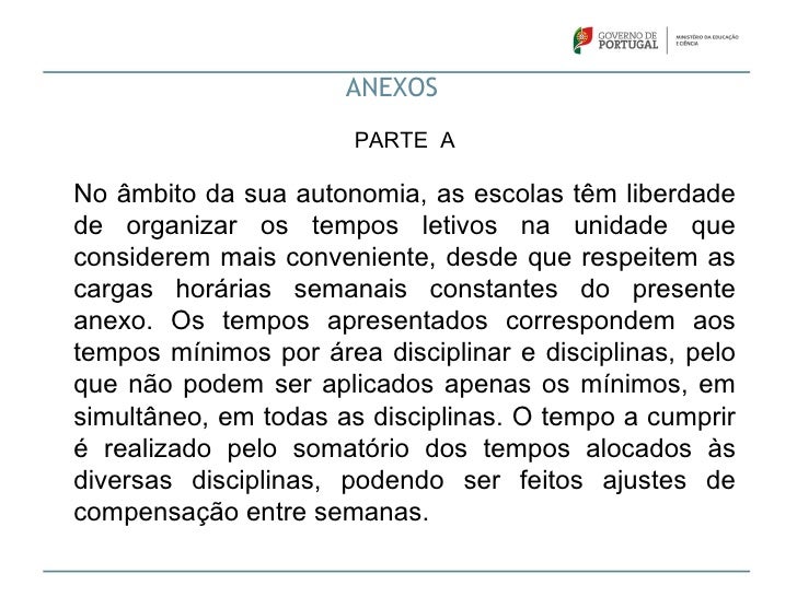 30. 30. ANEXOS PARTE ANo âmbito da sua autonomia, as escolas têm liberdadede organizar os tempos letivos na unidade queconsiderem mais conveniente, desde que respeitem ascargas horárias semanais constantes do presenteanexo. Os tempos apresentados correspondem aostempos mínimos por área disciplinar e disciplinas, peloque não podem ser aplicados apenas os mínimos, emsimultâneo, em todas as disciplinas. O tempo a cumpriré realizado pelo somatório dos tempos alocados àsdiversas disciplinas, podendo ser feitos ajustes decompensação entre semanas.