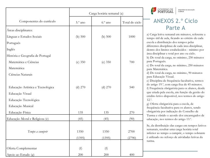 31. 31. Carga horária semanal (a) Componentes do currículo 5.º ano 6.º ano Total do ciclo ANEXOS 2.º CicloÁreas disciplinares: Parte A a) Carga letiva semanal em minutos, referente aLínguas e Estudos Sociais (b) 500 (b) 500 1000 tempo útil de aula, ficando ao critério de cadaPortuguês escola a distribuição dos tempos pelas diferentes disciplinas de cada área disciplinar,Inglês dentro dos limites estabelecidos - mínimo por área disciplinar e total por ano ou ciclo.História e Geografia de Portugal b) Do total da carga, no mínimo, 250 minutos Matemática e Ciências (c) 350 (c) 350 700 para Português. c) Do total da carga, no mínimo, 250 minutos Matemática para Matemática. d) Do total da carga, no mínimo, 90 minutos Ciências Naturais para Educação Visual. e) Disciplina de frequência facultativa, termos do artigo 19.º, com carga fixa de 45 minutos. Educação Artística e Tecnológica (d) 270 (d) 270 540 f) Frequência obrigatória para os alunos, desde Educação Visual que criada pela escola, em função da gestão do crédito letivo disponível, nos termos do artigo Educação Tecnológica 12.º. g) Oferta obrigatória para a escola, de Educação Musical frequência facultativa para os alunos, sendo Educação Física 135 135 270 obrigatória por indicação do Conselho de Turma e obtido o acordo dos encarregados deEducação Moral e Religiosa (e) (45) (45) (90) educação, nos termos do artigo 13.º. Se, da distribuição das cargas em tempos letivos semanais, resultar uma carga horária total Tempo a cumprir 1350 1350 2700 inferior ao tempo a cumprir, o tempo sobrante (1395) (1395) (2790) é utilizado no reforço de atividades letivas da turma.Oferta Complementar (f) (f)Apoio ao Estudo (g) 200 200 400