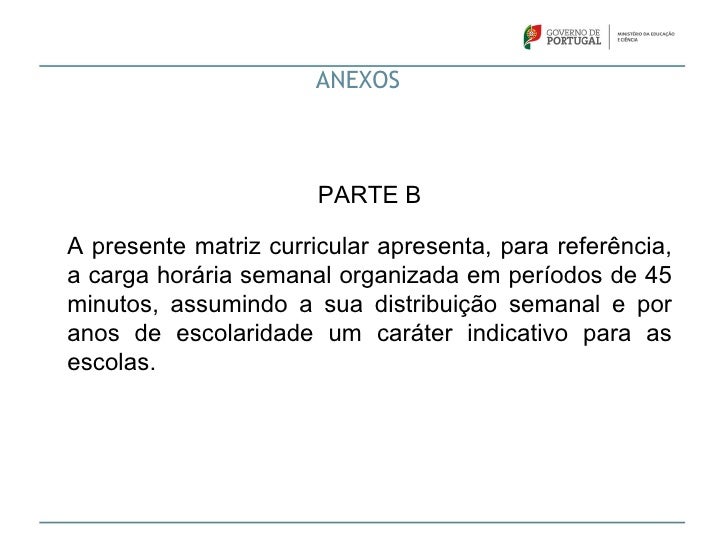 32. 32. ANEXOS PARTE BA presente matriz curricular apresenta, para referência,a carga horária semanal organizada em períodos de 45minutos, assumindo a sua distribuição semanal e poranos de escolaridade um caráter indicativo para asescolas.