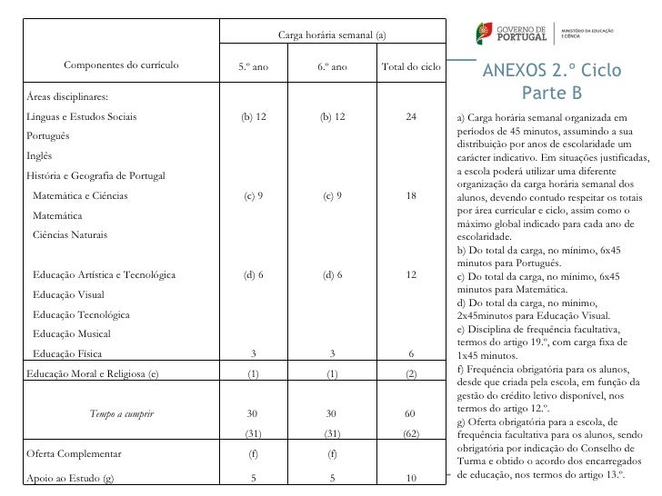33. 33. Carga horária semanal (a) Componentes do currículo 5.º ano 6.º ano Total do ciclo ANEXOS 2.º CicloÁreas disciplinares: Parte BLínguas e Estudos Sociais (b) 12 (b) 12 24 a) Carga horária semanal organizada emPortuguês períodos de 45 minutos, assumindo a sua distribuição por anos de escolaridade umInglês carácter indicativo. Em situações justificadas,História e Geografia de Portugal a escola poderá utilizar uma diferente organização da carga horária semanal dos Matemática e Ciências (c) 9 (c) 9 18 alunos, devendo contudo respeitar os totais Matemática por área curricular e ciclo, assim como o máximo global indicado para cada ano de Ciências Naturais escolaridade. b) Do total da carga, no mínimo, 6x45 minutos para Português. Educação Artística e Tecnológica (d) 6 (d) 6 12 c) Do total da carga, no mínimo, 6x45 Educação Visual minutos para Matemática. d) Do total da carga, no mínimo, Educação Tecnológica 2x45minutos para Educação Visual. Educação Musical e) Disciplina de frequência facultativa, termos do artigo 19.º, com carga fixa de Educação Física 3 3 6 1x45 minutos.Educação Moral e Religiosa (e) (1) (1) (2) f) Frequência obrigatória para os alunos, desde que criada pela escola, em função da gestão do crédito letivo disponível, nos Tempo a cumprir 30 30 60 termos do artigo 12.º. g) Oferta obrigatória para a escola, de (31) (31) (62) frequência facultativa para os alunos, sendo obrigatória por indicação do Conselho deOferta Complementar (f) (f) Turma e obtido o acordo dos encarregadosApoio ao Estudo (g) 5 5 10 de educação, nos termos do artigo 13.º.