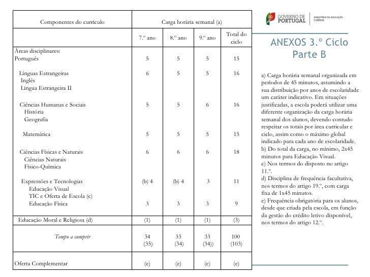 35. 35. Componentes do currículo Carga horária semanal (a) Total do 7.º ano 8.º ano 9.º ano ciclo ANEXOS 3.º CicloÁreas disciplinares:Português 5 5 5 15 Parte B Línguas Estrangeiras 6 5 5 16 a) Carga horária semanal organizada em Inglês períodos de 45 minutos, assumindo a Língua Estrangeira II sua distribuição por anos de escolaridade um caráter indicativo. Em situações Ciências Humanas e Sociais 5 5 6 16 justificadas, a escola poderá utilizar uma História diferente organização da carga horária Geografia semanal dos alunos, devendo contudo respeitar os totais por área curricular e Matemática 5 5 5 15 ciclo, assim como o máximo global indicado para cada ano de escolaridade. b) Do total da carga, no mínimo, 2x45 Ciências Físicas e Naturais 6 6 6 18 minutos para Educação Visual. Ciências Naturais c) Nos termos do disposto no artigo Físico-Química 11.º. d) Disciplina de frequência facultativa, Expressões e Tecnologias (b) 4 (b) 4 3 11 nos termos do artigo 19.º, com carga Educação Visual fixa de 1x45 minutos. TIC e Oferta de Escola (c) e) Frequência obrigatória para os alunos, Educação Física 3 3 3 9 desde que criada pela escola, em função da gestão do crédito letivo disponível, Educação Moral e Religiosa (d) (1) (1) (1) (3) nos termos do artigo 12.º. Tempo a cumprir 34 33 33 100 (35) (34) (34)) (103)Oferta Complementar (e) (e) (e) (e)