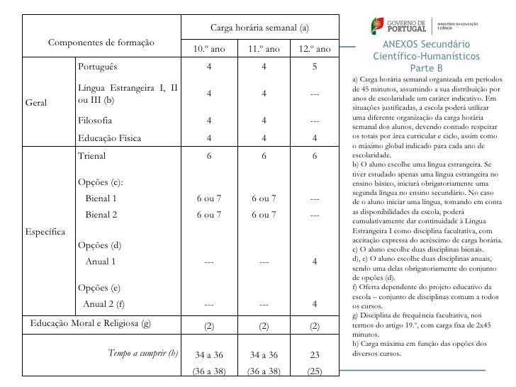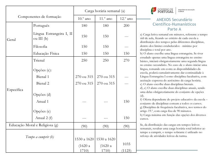 36. 36. Carga horária semanal (a) Componentes de formação 10.º ano 11.º ano 12.º ano ANEXOS Secundário Português 180 180 200 Científico-Humanísticos Parte A Língua Estrangeira I, II a) Carga letiva semanal em minutos, referente a tempo 150 150 ---Geral ou III (b) útil de aula, ficando ao critério de cada escola a distribuição dos tempos pelas diferentes disciplinas, Filosofia 150 150 --- dentro dos limites estabelecidos - mínimo por disciplina e total por ano. Educação Física 150 150 150 b) O aluno escolhe uma língua estrangeira. Se tiver estudado apenas uma língua estrangeira no ensino Trienal 250 250 270 básico, iniciará obrigatoriamente uma segunda língua no ensino secundário. No caso de o aluno iniciar uma língua, tomando em conta as disponibilidades da Opções (c): escola, poderá cumulativamente dar continuidade à Bienal 1 270 ou 315 270 ou 315 --- Língua Estrangeira I como disciplina facultativa, com aceitação expressa do acréscimo de carga horária. Bienal 2 270 ou 315 270 ou 315 --- c) O aluno escolhe duas disciplinas bienais. d), e) O aluno escolhe duas disciplinas anuais, sendoEspecífica uma delas obrigatoriamente do conjunto de opções Opções (d) (d). f) Oferta dependente do projeto educativo da escola – Anual 1 --- --- 150 conjunto de disciplinas comum a todos os cursos. g) Disciplina de frequência facultativa, nos termos do Opções (e) artigo 19.º, com carga fixa de 90 minutos. h) Carga máxima em função das opções dos diversos Anual 2 (f) --- --- 150 cursos. Educação Moral e Religiosa (g) Se, da distribuição das cargas em tempos letivos (90) (90) (90) semanais, resultar uma carga horária total inferior ao tempo a cumprir, o tempo sobrante é utilizado no Tempo a cumprir (h) reforço de atividades letivas da turma. 1530 a 1620 1530 a 1620 (1620 a (1620 a 1035 1710) 1710) (1125)