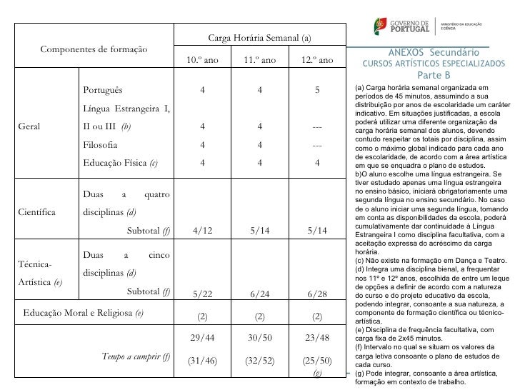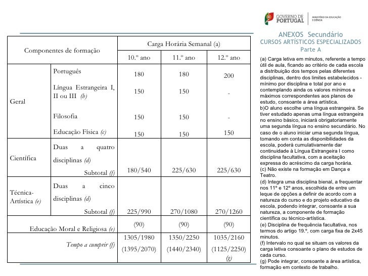 38. 38. ANEXOS Secundário Carga Horária Semanal (a) CURSOS ARTÍSTICOS ESPECIALIZADOS Componentes de formação Parte A 10.º ano 11.º ano 12.º ano (a) Carga letiva em minutos, referente a tempo útil de aula, ficando ao critério de cada escola Português 180 180 a distribuição dos tempos pelas diferentes 200 disciplinas, dentro dos limites estabelecidos - mínimo por disciplina e total por ano e Língua Estrangeira I, contemplando ainda os valores mínimos e 150 150 - II ou III (b) máximos correspondentes aos planos deGeral estudo, consoante a área artística. b)O aluno escolhe uma língua estrangeira. Se Filosofia tiver estudado apenas uma língua estrangeira 150 150 - no ensino básico, iniciará obrigatoriamente uma segunda língua no ensino secundário. No Educação Física (c) 150 150 150 caso de o aluno iniciar uma segunda língua, tomando em conta as disponibilidades da escola, poderá cumulativamente dar Duas a quatro continuidade à Língua Estrangeira I comoCientífica disciplinas (d) disciplina facultativa, com a aceitação expressa do acréscimo da carga horária. Subtotal (f) 180/540 225/630 225/630 (c) Não existe na formação em Dança e Teatro. (d) Integra uma disciplina bienal, a frequentar Duas a cinco nos 11º e 12º anos, escolhida de entre umTécnica- leque de opções a definir de acordo com aArtística (e) disciplinas (d) natureza do curso e do projeto educativo da escola, podendo integrar, consoante a sua Subtotal (f) 225/990 270/1080 270/1260 natureza, a componente de formação científica ou técnico-artística. (90) (90) (90) (e) Disciplina de frequência facultativa, nos Educação Moral e Religiosa (e) termos do artigo 19.º, com carga fixa de 2x45 1305/1980 1350/2250 1035/2160 minutos. Tempo a cumprir (f) (f) Intervalo no qual se situam os valores da (1395/2070) (1440/2340) (1125/2250) carga letiva consoante o plano de estudos de cada curso. (g) (g) Pode integrar, consoante a área artística, formação em contexto de trabalho.