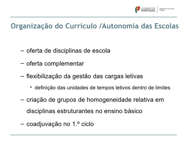 4. 4. Organização do Currículo /Autonomia das Escolas – oferta de disciplinas de escola – oferta complementar – flexibilização da gestão das cargas letivas • definição das unidades de tempos letivos dentro de limites – criação de grupos de homogeneidade relativa em disciplinas estruturantes no ensino básico – coadjuvação no 1.º ciclo