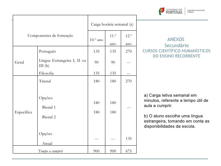 41. 41. Carga horária semanal (a) Componentes de formação 11.º 12.º 10.º ano ANEXOS ano ano Secundário Português 135 135 270 CURSOS CIENTÍFICO-HUMANÍSTICOS DO ENSINO RECORRENTEGeral Língua Estrangeira I, II ou 90 90 --- III (b) Filosofia 135 135 --- Trienal 180 180 270 a) Carga letiva semanal em Opções: 180 180 minutos, referente a tempo útil de Bienal 1 --- aula a cumprir.Específica 180 180 Bienal 2 b) O aluno escolhe uma língua estrangeira, tomando em conta as disponibilidades da escola. Opções --- --- 135 Anual Tempo a cumprir 900 900 675
