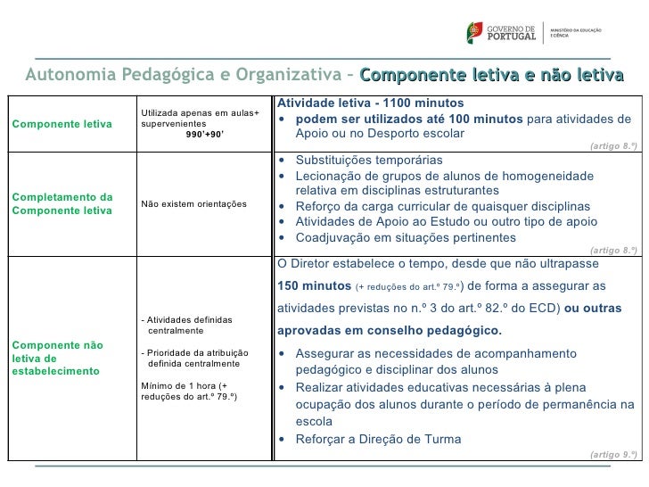 48. 48. Autonomia Pedagógica e Organizativa – Componente letiva e não letiva Atividade letiva - 1100 minutos Utilizada apenas em aulas+Componente letiva supervenientes • podem ser utilizados até 100 minutos para atividades de 990’+90’ Apoio ou no Desporto escolar (artigo 8.º) • Substituições temporárias • Lecionação de grupos de alunos de homogeneidadeCompletamento da relativa em disciplinas estruturantesComponente letiva Não existem orientações • Reforço da carga curricular de quaisquer disciplinas • Atividades de Apoio ao Estudo ou outro tipo de apoio • Coadjuvação em situações pertinentes (artigo 8.º) O Diretor estabelece o tempo, desde que não ultrapasse 150 minutos (+ reduções do art.º 79.º) de forma a assegurar as atividades previstas no n.º 3 do art.º 82.º do ECD) ou outras - Atividades definidas centralmente aprovadas em conselho pedagógico.Componente nãoletiva de - Prioridade da atribuição • Assegurar as necessidades de acompanhamento definida centralmenteestabelecimento pedagógico e disciplinar dos alunos Mínimo de 1 hora (+ • Realizar atividades educativas necessárias à plena reduções do art.º 79.º) ocupação dos alunos durante o período de permanência na escola • Reforçar a Direção de Turma (artigo 9.º)