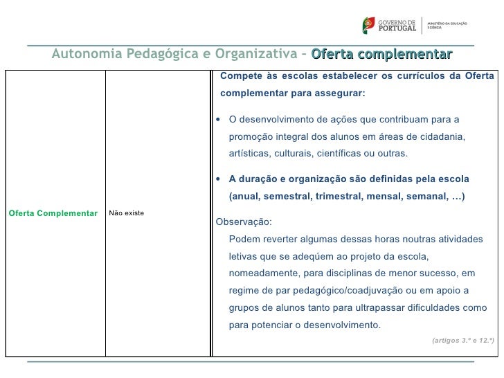50. 50. Autonomia Pedagógica e Organizativa – Oferta complementar Compete às escolas estabelecer os currículos da Oferta complementar para assegurar: • O desenvolvimento de ações que contribuam para a promoção integral dos alunos em áreas de cidadania, artísticas, culturais, científicas ou outras. • A duração e organização são definidas pela escola (anual, semestral, trimestral, mensal, semanal, …)Oferta Complementar Não existe Observação: Podem reverter algumas dessas horas noutras atividades letivas que se adeqúem ao projeto da escola, nomeadamente, para disciplinas de menor sucesso, em regime de par pedagógico/coadjuvação ou em apoio a grupos de alunos tanto para ultrapassar dificuldades como para potenciar o desenvolvimento. (artigos 3.º e 12.º)