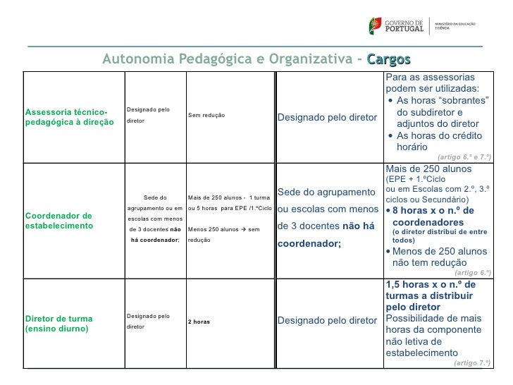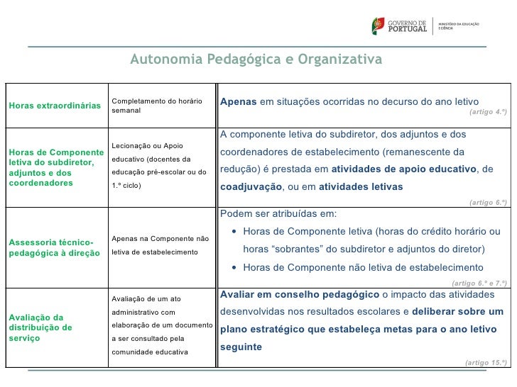 52. 52. Autonomia Pedagógica e OrganizativaHoras extraordinárias Completamento do horário Apenas em situações ocorridas no decurso do ano letivo semanal (artigo 4.º) A componente letiva do subdiretor, dos adjuntos e dos Lecionação ou ApoioHoras de Componente coordenadores de estabelecimento (remanescente da educativo (docentes daletiva do subdiretor,adjuntos e dos educação pré-escolar ou do redução) é prestada em atividades de apoio educativo, decoordenadores 1.º ciclo) coadjuvação, ou em atividades letivas (artigo 6.º) Podem ser atribuídas em: • Horas de Componente letiva (horas do crédito horário ou Apenas na Componente nãoAssessoria técnico-pedagógica à direção letiva de estabelecimento horas “sobrantes” do subdiretor e adjuntos do diretor) • Horas de Componente não letiva de estabelecimento (artigo 6.º e 7.º) Avaliação de um ato Avaliar em conselho pedagógico o impacto das atividades administrativo com desenvolvidas nos resultados escolares e deliberar sobre umAvaliação dadistribuição de elaboração de um documento plano estratégico que estabeleça metas para o ano letivoserviço a ser consultado pela comunidade educativa seguinte (artigo 15.º)