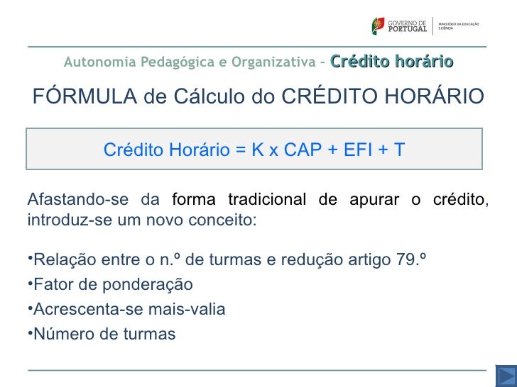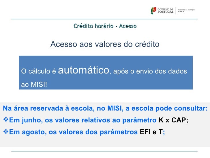 56. 56. Crédito horário - Acesso Acesso aos valores do crédito O cálculo é automático, após o envio dos dados ao MISI!Na área reservada à escola, no MISI, a escola pode consultar:Em junho, os valores relativos ao parâmetro K x CAP;Em agosto, os valores dos parâmetros EFI e T;