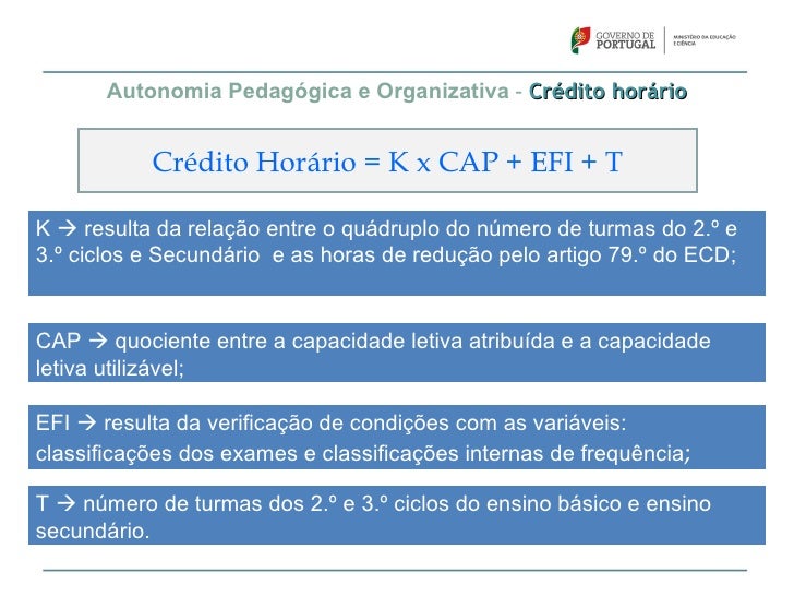 57. 57. Autonomia Pedagógica e Organizativa – Crédito horário Crédito Horário = K x CAP + EFI + TK  resulta da relação entre o quádruplo do número de turmas do 2.º e3.º ciclos e Secundário e as horas de redução pelo artigo 79.º do ECD;CAP  quociente entre a capacidade letiva atribuída e a capacidadeletiva utilizável;EFI  resulta da verificação de condições com as variáveis:classificações dos exames e classificações internas de frequência;T  número de turmas dos 2.º e 3.º ciclos do ensino básico e ensinosecundário.