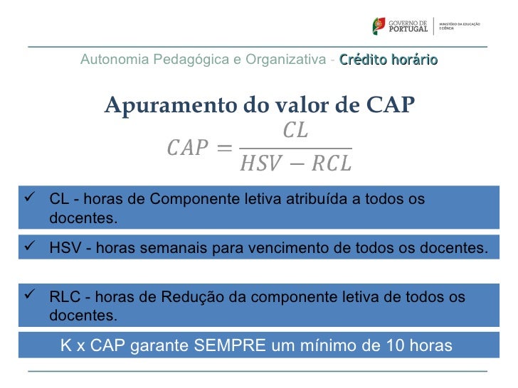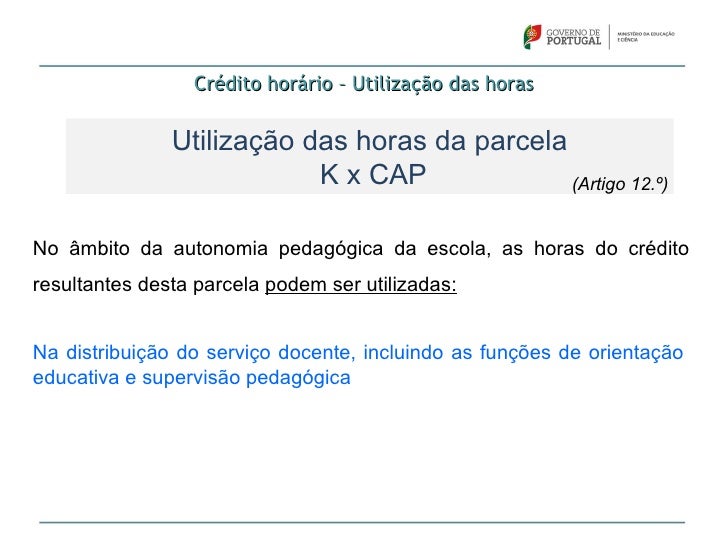 70. 70. Crédito horário – Utilização das horas Utilização das horas da parcela K x CAP (Artigo 12.º)No âmbito da autonomia pedagógica da escola, as horas do créditoresultantes desta parcela podem ser utilizadas:Na distribuição do serviço docente, incluindo as funções de orientaçãoeducativa e supervisão pedagógica