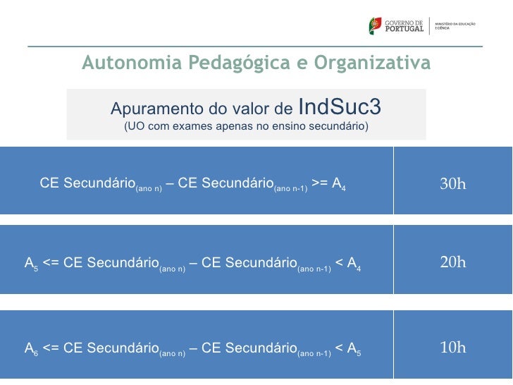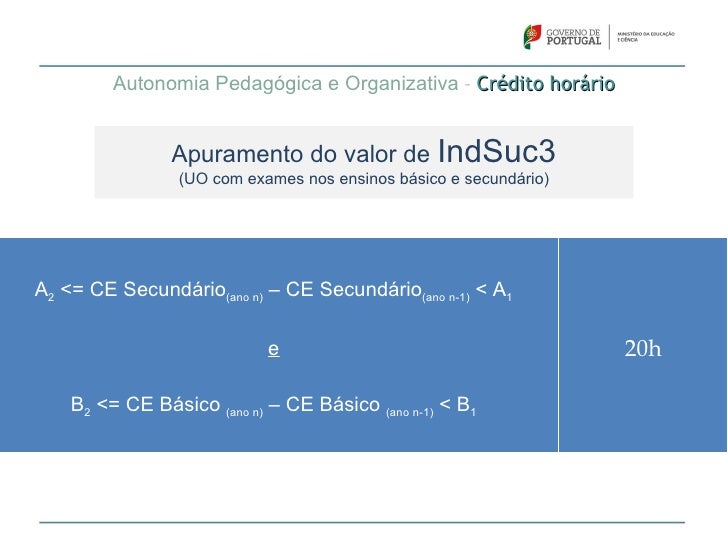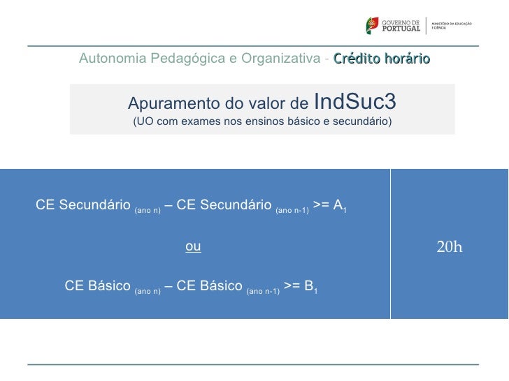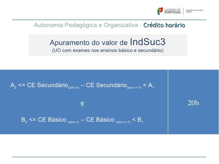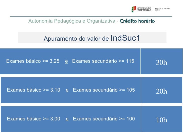 61. 61. Autonomia Pedagógica e Organizativa – Crédito horário Apuramento do valor de IndSuc1Exames básico >= 3,25 e Exames secundário >= 115 30hExames básico >= 3,10 e Exames secundário >= 105 20hExames básico >= 3,00 e Exames secundário >= 100 10h