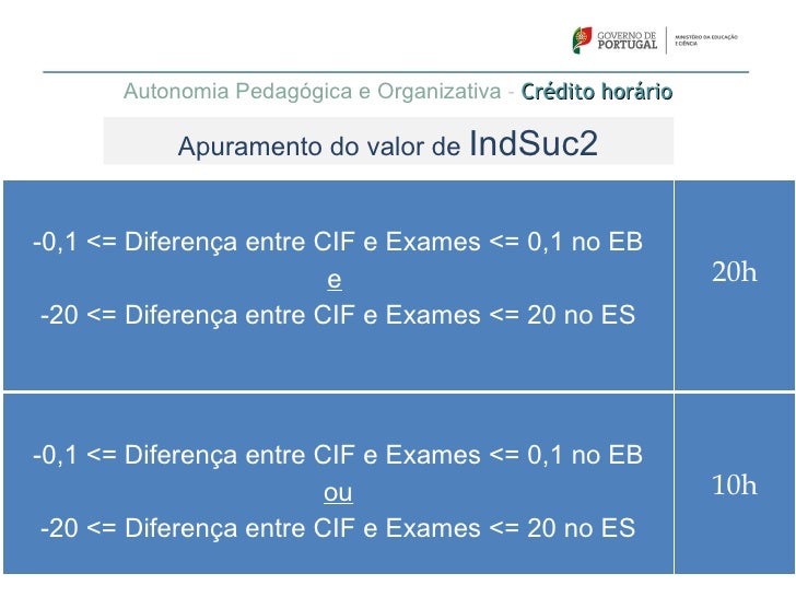 62. 62. Autonomia Pedagógica e Organizativa – Crédito horário Apuramento do valor de IndSuc2-0,1 <= Diferença entre CIF e Exames <= 0,1 no EB e 20h -20 <= Diferença entre CIF e Exames <= 20 no ES-0,1 <= Diferença entre CIF e Exames <= 0,1 no EB ou 10h -20 <= Diferença entre CIF e Exames <= 20 no ES