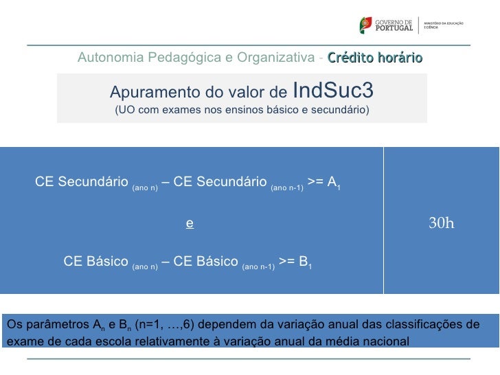 63. 63. Autonomia Pedagógica e Organizativa – Crédito horário Apuramento do valor de IndSuc3 (UO com exames nos ensinos básico e secundário) CE Secundário (ano n) – CE Secundário (ano n-1) >= A1 e 30h CE Básico (ano n) – CE Básico (ano n-1) >= B1Os parâmetros An e Bn (n=1, …,6) dependem da variação anual das classificações deexame de cada escola relativamente à variação anual da média nacional