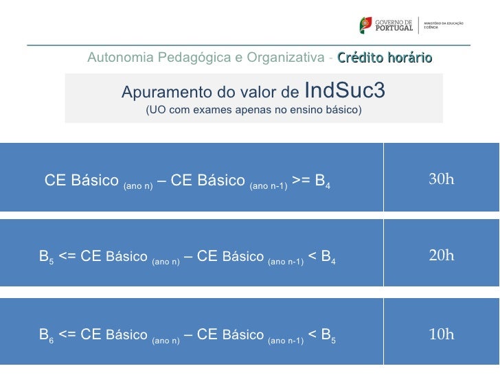68. 68. Autonomia Pedagógica e Organizativa – Crédito horário Apuramento do valor de IndSuc3 (UO com exames apenas no ensino básico)CE Básico (ano n) – CE Básico (ano n-1) >= B4 30hB5 <= CE Básico (ano n) – CE Básico (ano n-1) < B4 20hB6 <= CE Básico (ano n) – CE Básico (ano n-1) < B5 10h