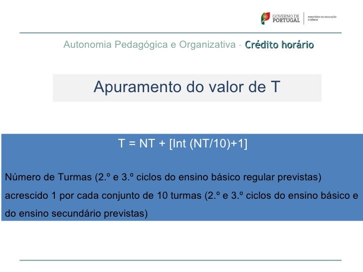 69. 69. Autonomia Pedagógica e Organizativa – Crédito horário Apuramento do valor de T T = NT + [Int (NT/10)+1]Número de Turmas (2.º e 3.º ciclos do ensino básico regular previstas)acrescido 1 por cada conjunto de 10 turmas (2.º e 3.º ciclos do ensino básico edo ensino secundário previstas)