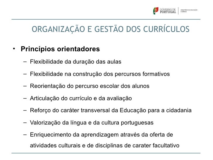 7. 7. ORGANIZAÇÃO E GESTÃO DOS CURRÍCULOS• Princípios orientadores – Flexibilidade da duração das aulas – Flexibilidade na construção dos percursos formativos – Reorientação do percurso escolar dos alunos – Articulação do currículo e da avaliação – Reforço do caráter transversal da Educação para a cidadania – Valorização da língua e da cultura portuguesas – Enriquecimento da aprendizagem através da oferta de atividades culturais e de disciplinas de carater facultativo