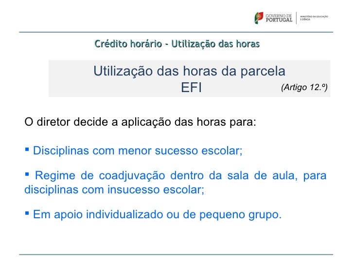 71. 71. Crédito horário - Utilização das horas Utilização das horas da parcela EFI (Artigo 12.º)O diretor decide a aplicação das horas para: Disciplinas com menor sucesso escolar; Regime de coadjuvação dentro da sala de aula, paradisciplinas com insucesso escolar; Em apoio individualizado ou de pequeno grupo.