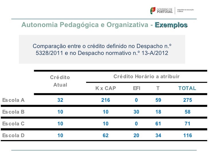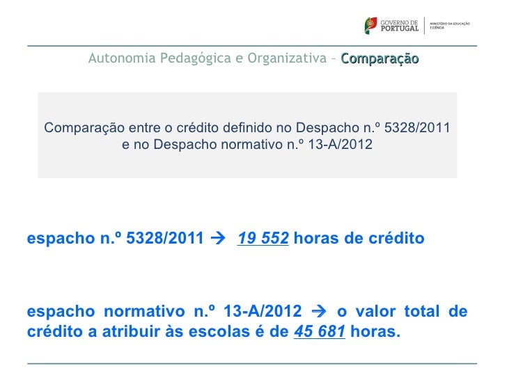 72. 72. Autonomia Pedagógica e Organizativa – Comparação Comparação entre o crédito definido no Despacho n.º 5328/2011 e no Despacho normativo n.º 13-A/2012espacho n.º 5328/2011  19 552 horas de créditoespacho normativo n.º 13-A/2012  o valor total decrédito a atribuir às escolas é de 45 681 horas.