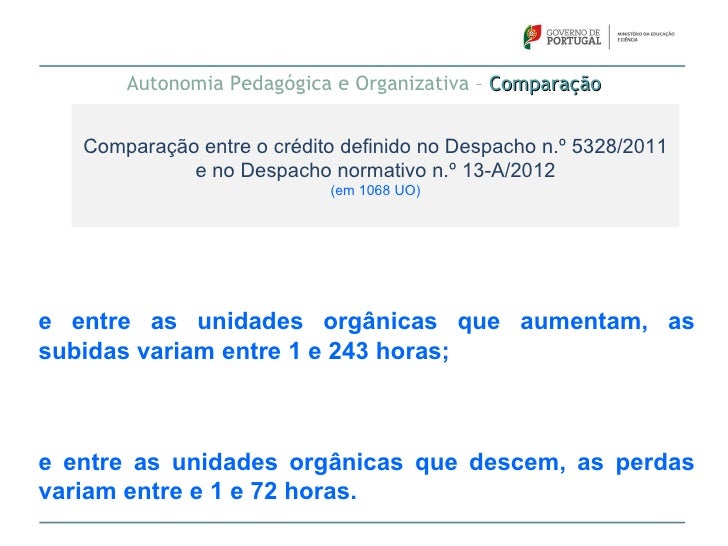 76. 76. Autonomia Pedagógica e Organizativa – Comparação Comparação entre o crédito definido no Despacho n.º 5328/2011 e no Despacho normativo n.º 13-A/2012 (em 1068 UO)e entre as unidades orgânicas que aumentam, assubidas variam entre 1 e 243 horas;e entre as unidades orgânicas que descem, as perdasvariam entre e 1 e 72 horas.