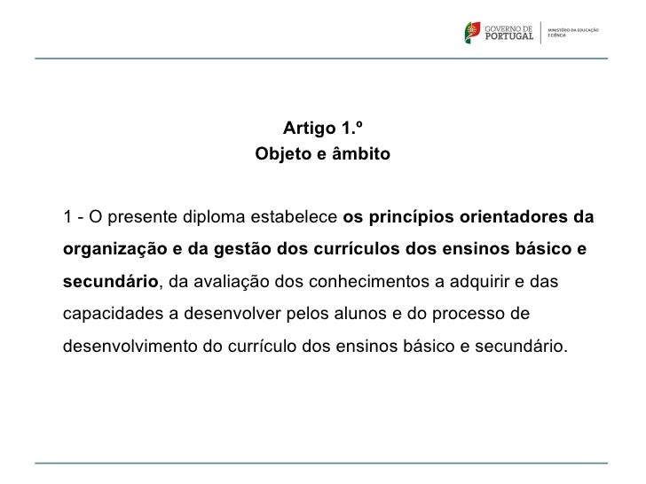 8. 8. Artigo 1.º Objeto e âmbito1 - O presente diploma estabelece os princípios orientadores daorganização e da gestão dos currículos dos ensinos básico esecundário, da avaliação dos conhecimentos a adquirir e dascapacidades a desenvolver pelos alunos e do processo dedesenvolvimento do currículo dos ensinos básico e secundário.