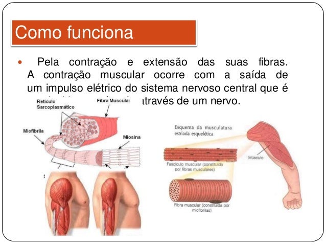 4. 4.  Pela contração e extensão das suas fibras. A contração muscular ocorre com a saída de um impulso elétrico do sistema nervoso central que é conduzido ao músculo através de um nervo. Como funciona