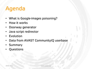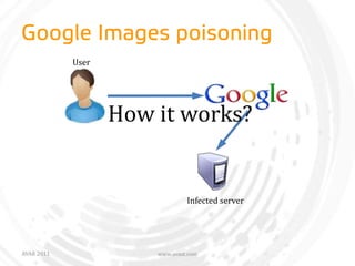 There have long been links on the internet that take the unwary user to a page with unexpected or malicious content. Most of these attempts rely on the user to click on the link to be successful. However, the latest variation has moved beyond simple text links to "Google-image poisoning" - placing malware in the middle of Google searches for images where users have traditionally had no reason to be wary. Our presentation will focus on How malware writers are able to infect the average website; detailed analyses of the PHP script used to infect s ites and SEO techniques to get infected images at the top of search results.