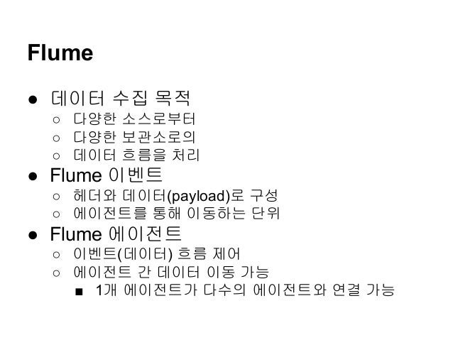 2. 2. Flume ● 데이터 수집 목적 ○ 다양한 소스로부터 ○ 다양한 보관소로의 ○ 데이터 흐름을 처리 ● Flume 이벤트 ○ 헤더와 데이터(payload)로 구성 ○ 에이전트를 통해 이동하는 단위 ● Flume 에이전트 ○ 이벤트(데이터) 흐름 제어 ○ 에이전트 간 데이터 이동 가능 ■ 1개 에이전트가 다수의 에이전트와 연결 가능