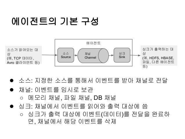 3. 3. 에이전트의 기본 구성 에이전트 소스가 읽어오는 대 상 (예, TCP 데이터, Avro 클라이언트 등) 소스 Source 채널 Channel 싱크 Sink 싱크가 출력하는 대 상 (예, HDFS, HBASE, 파일, 다른 에이전트 등) ● 소스: 지정한 소스를 통해서 이벤트를 받아 채널로 전달 ● 채널: 이벤트를 임시로 보관 ● ○ 메모리 채널, 파일 채널, DB 채널 싱크: 채널에서 이벤트를 읽어와 출력 대상에 씀 ○ 싱크가 출력 대상에 이벤트(데이터)를 전달을 완료하 면, 채널에서 해당 이벤트를 삭제