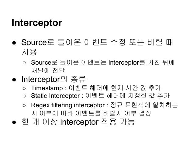 9. 9. Interceptor ● Source로 들어온 이벤트 수정 또는 버릴 때 사용 ○ Source로 들어온 이벤트는 interceptor를 거친 뒤에 채널에 전달 ● Interceptor의 종류 ○ Timestamp : 이벤트 헤더에 현재 시간 값 추가 ○ Static Interceptor : 이벤트 헤더에 지정한 값 추가 ○ Regex filtering interceptor : 정규 표현식에 일치하는 지 여부에 따라 이벤트를 버릴지 여부 결정 ● 한 개 이상 interceptor 적용 가능