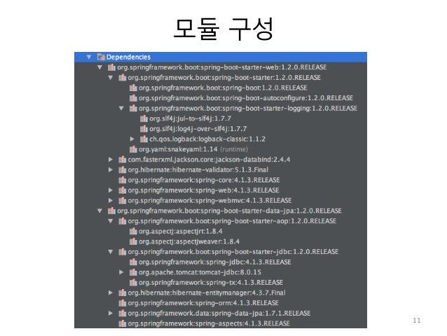 10. 10. Boot가 해 준 것 1, 모듈 설정 <parent>          <groupId>org.springframework.boot</groupId>          <ar:factId>spring-­‐boot-­‐starter-­‐parent</ar:factId>          <version>1.2.0.RELEASE</version>   </parent>     <dependencies>          <dependency>                  <groupId>org.springframework.boot</groupId>                  <ar:factId>spring-­‐boot-­‐starter-­‐web</ar:factId>          </dependency>          <dependency>                  <groupId>org.springframework.boot</groupId>                  <ar:factId>spring-­‐boot-­‐starter-­‐data-­‐jpa</ar:factId>          </dependency>          <dependency>                  <groupId>org.springframework.boot</groupId>                  <ar:factId>spring-­‐boot-­‐starter-­‐test</ar:factId>          </dependency>        <dependency>                  <groupId>org.springframework.boot</groupId>                  <ar:factId>spring-­‐boot-­‐starter-­‐tomcat</ar:factId>                  <scope>provided</scope>          </dependency>          <dependency>                  <groupId>org.apache.tomcat.embed</groupId>                  <ar:factId>tomcat-­‐embed-­‐jasper</ar:factId>                  <scope>provided</scope>          </dependency>   </dependencies>   표준 버전 모음   spring-­‐mvc 등 웹 관련 모듈 자동 설정   spring-­‐data-­‐jpa,  JPA,  Hibernate 관련 모듈 설정   연관된 spring-­‐orm,  커넥션 풀 등 모듈 설정   spring-­‐test,  JUnit  등 관련 모듈 설정   임베디드 톰캣 관련 모듈 설정   10