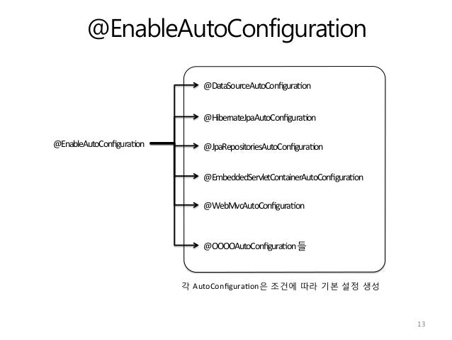 13. 13. @EnableAutoConfiguration @EnableAutoConfigura:on   @JpaRepositoriesAutoConfigura:on   @HibernateJpaAutoConfigura:on   @EmbeddedServletContainerAutoConfigura:on   @WebMvcAutoConfigura:on   @DataSourceAutoConfigura:on   @OOOOAutoConfigura:on  들   각 AutoConfigura:on은 조건에 따라 기본 설정 생성   13