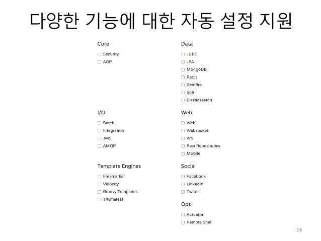 15. 15. Boot가 해 준 것 4, 실행 가능 war 생성 •  패키징한 war를 java 명령어로 실행 가능 – mvn package – java -jar target/myapp.war •  임베디드 톰캣으로 실행 •  생성된 war를 일반 WAS에 배포해도 됨 •  war가 아닌 jar 타입으로도 가능 15