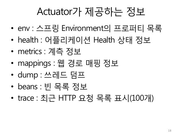 18. 18. Actuator가 제공하는 정보 •  env : 스프링 Environment의 프로퍼티 목록 •  health : 어플리케이션 Health 상태 정보 •  metrics : 계측 정보 •  mappings : 웹 경로 매핑 정보 •  dump : 쓰레드 덤프 •  beans : 빈 목록 정보 •  trace : 최근 HTTP 요청 목록 표시(100개) 18