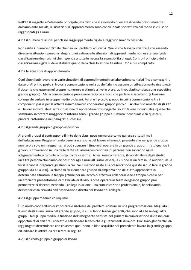 12. 12. 12 Nell’EP il soggetto è l’elemento principale, ma dato che il suo modo di essere dipende principalmente dall’ambiente sociale, le situazioni di apprendimento sono condizionale soprattutto dal modo in cui sono raggruppati gli alunni. 4.2.1 il numero di alunni per classe raggruppamento rigido e raggruppamento flessibile Non esiste il numero ottimale che risolva i problemi educativi. Quello che bisogna chiarire è che essendo diverse le situazioni personali degli alunni e diverse le situazioni di apprendimento non esiste una rigida classificazione degli alunni che risponda a tutte le necessità e possibilità di oggi. Contro il principio della classificazione rigida si deve stabilire quello della classificazione flessibile. Ciò è più complicato. 4.2.2 le situazioni di apprendimento Ogni alunni può lavorare in varie situazioni di apprendimento:in collaborazione con altri (ins e compagni) , da solo. Al primo posto si trova la comunicazione nella quale l’alunno assume un atteggiamento ricettivo:è il docente che espone nel gruppo numeroso o stimola a livello orale, uditivo, plastico (situazione espositiva grande gruppo). Ma la comunicazione può essere reciproca:molti che parlano e ascoltano. (situazione colloquiale verbale in gruppo medio o classe). Poi vi è il piccolo gruppo in cui la comunicazione tra i componenti passa per le attività insieme(lavoro cooperativo gruppo piccolo . Anche l’isolamento dagli altri e il lavoro individuale è altra situazione di apprendimento (soggetto isolato lavoro individuale). Quelle che sembrano incontrare maggiore resistenza sono il grande gruppo e il lavoro individuale e su queste si punterà l’attenzione nei paragrafi successivi. 4.2.3 il grande gruppo o gruppo espositivo Ai grandi gruppi si contrappone il mito delle classi poco numerose come panacea a tutti i mali dell’educazione. Programmando bene la scansione del lavoro e tenendo presente che nel grande gruppo non lavora solo un insegnante, si può superare il timore di operare in un grande gruppo. Infatti quando i giovani si troveranno in una delle tante situazioni con centinaia di persone non sapranno agire adeguatamente:o tumulto o disciplina da caserma. Ad es. una conferenza, il coordinatore degli studi o un’altra persona che danno disposizioni agli alunni all’ inizio lezioni, la visione di un film in un auditorium…è forse il caso di preparare gli alunni a ciò. Se il metodo usato è la presentazione questo si può fare in grande gruppo (da 45 a 200). La classe di 30 elementi è gruppo di ampiezza non del tutto appropriata in determinate situazioni:è troppo grande per un lavoro di effettiva collaborazione e troppo piccolo per un’efficiente presentazione di materiale di studio. Anche operare in team nel grande gruppo può permettere ai docenti, vedendo il collega in azione, una comunicazione professionale, beneficiando dell’esperienza ricavata dall’osservazione diretta del lavoro dei colleghi. 4.2.4 il gruppo medio o colloquiale È un modo cooperativo di impostare e risolvere dei problemi comuni. In una programmazione adeguata il lavoro degli alunni inizia nel grande gruppo, in cui si fanno lezioni generali, che sono alla base degli altri gruppi. Nel gruppo medio la funzione dell’insegnante consiste nel guidare la conversazione di classe, con opportunità di chiarire i concetti e selezionare le tecniche e gli strumenti di lavoro. Due sono gli obiettivi da raggiungere:determinare con chiarezza quali sono le idee acquisite nel precedente lavoro in grande gruppo ed indicare le attvità da realizzare in seguito. 4.2.5 il piccolo gruppo o gruppo di lavoro