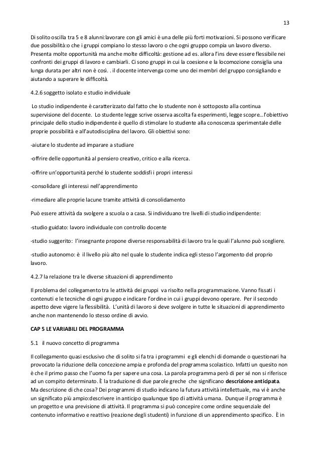 13. 13. 13 Di solito oscilla tra 5 e 8 alunni:lavorare con gli amici è una delle più forti motivazioni. Si possono verificare due possibilità:o che i gruppi compiano lo stesso lavoro o che ogni gruppo compia un lavoro diverso. Presenta molte opportunità ma anche molte difficoltà: gestione ad es. allora l’ins deve essere flessibile nei confronti dei gruppi di lavoro e cambiarli. Ci sono gruppi in cui la coesione e la locomozione consiglia una lunga durata per altri non è così. . il docente intervenga come uno dei membri del gruppo consigliando e aiutando a superare le difficoltà. 4.2.6 soggetto isolato e studio individuale Lo studio indipendente è caratterizzato dal fatto che lo studente non è sottoposto alla continua supervisione del docente. Lo studente legge scrive osserva ascolta fa esperimenti, legge scopre…l’obiettivo principale dello studio indipendente è quello di stimolare lo studente alla conoscenza sperimentale delle proprie possibilità e all’autodisciplina del lavoro. Gli obiettivi sono: -aiutare lo studente ad imparare a studiare -offrire delle opportunità al pensiero creativo, critico e alla ricerca. -offrire un’opportunità perché lo studente soddisfi i propri interessi -consolidare gli interessi nell’apprendimento -rimediare alle proprie lacune tramite attività di consolidamento Può essere attività da svolgere a scuola o a casa. Si individuano tre livelli di studio indipendente: -studio guidato: lavoro individuale con controllo docente -studio suggerito: l’insegnante propone diverse responsabilità di lavoro tra le quali l’alunno può scegliere. -studio autonomo: è il livello più alto nel quale lo studente indica egli stesso l’argomento del proprio lavoro. 4.2.7 la relazione tra le diverse situazioni di apprendimento Il problema del collegamento tra le attività dei gruppi va risolto nella programmazione. Vanno fissati i contenuti e le tecniche di ogni gruppo e indicare l’ordine in cui i gruppi devono operare. Per il secondo aspetto deve vigere la flessibilità. L’unità di lavoro si deve svolgere in tutte le situazioni di apprendimento anche non mantenendo lo stesso ordine di avvio. CAP 5 LE VARIABILI DEL PROGRAMMA 5.1 il nuovo concetto di programma Il collegamento quasi esclusivo che di solito si fa tra i programmi e gli elenchi di domande o questionari ha provocato la riduzione della concezione ampia e profonda del programma scolastico. Infatti un quesito non è che il primo passo che l’uomo fa per sapere una cosa. La parola programma però di per sé non si riferisce ad un compito determinato. È la traduzione di due parole greche che significano descrizione anticipata. Ma descrizione di che cosa? Dei programmi di studio indicano la futura attività intellettuale, ma vi è anche un significato più ampio:descrivere in anticipo qualunque tipo di attività umana. Dunque il programma è un progetto e una previsione di attività. Il programma si può concepire come ordine sequenziale del contenuto informativo e reattivo (reazione degli studenti) in funzione di un apprendimento specifico. È in